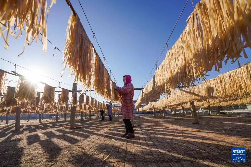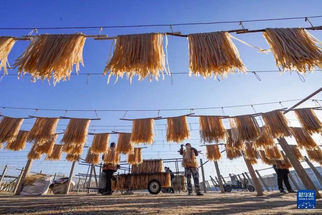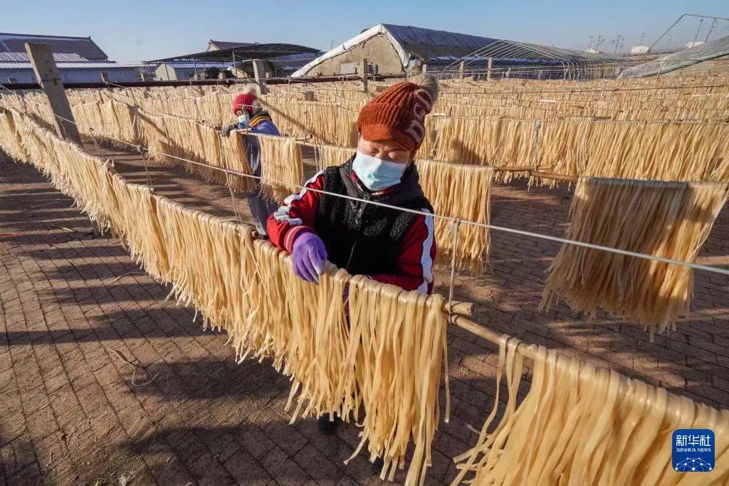 1月15日,农民在河北省遵化市平安城镇一家粉条加工专业合作社的场院晾晒粉条。新华社发(刘满仓摄)