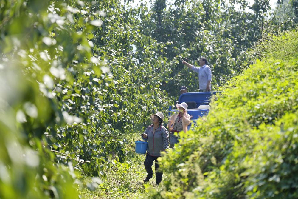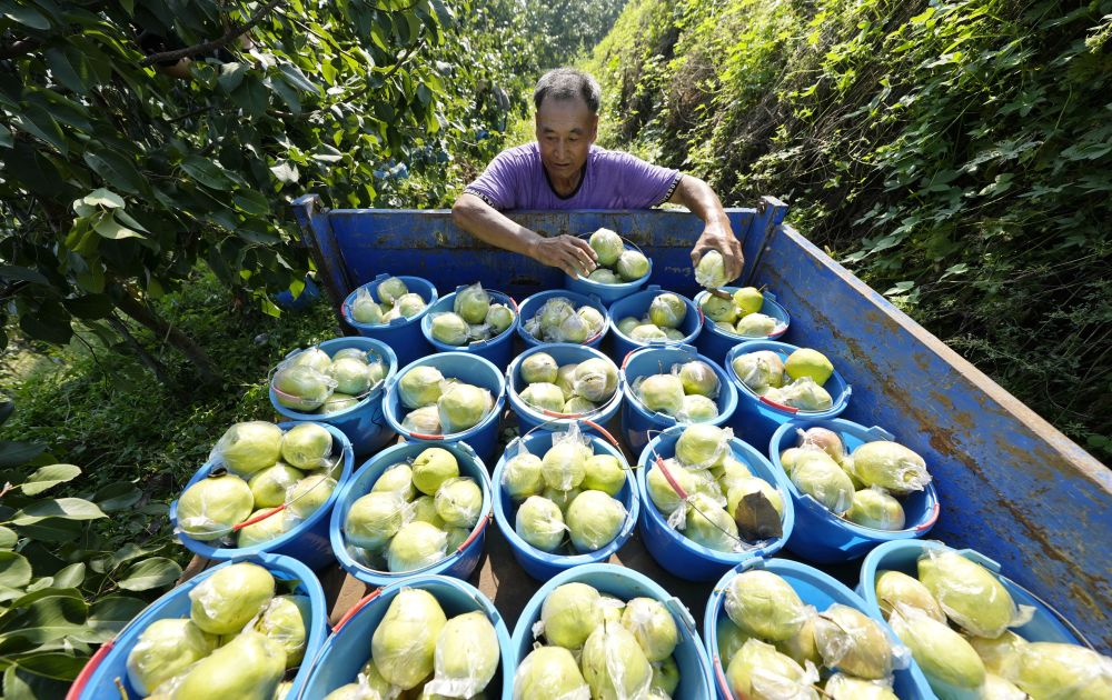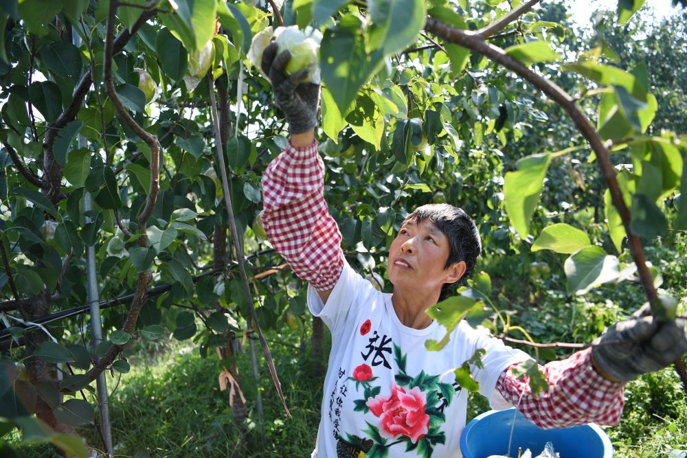 ↑9月15日,农民在河北省玉田县唐自头镇一处经荒山开发而建的果园内采摘鲜梨。新华社记者 牟宇 摄