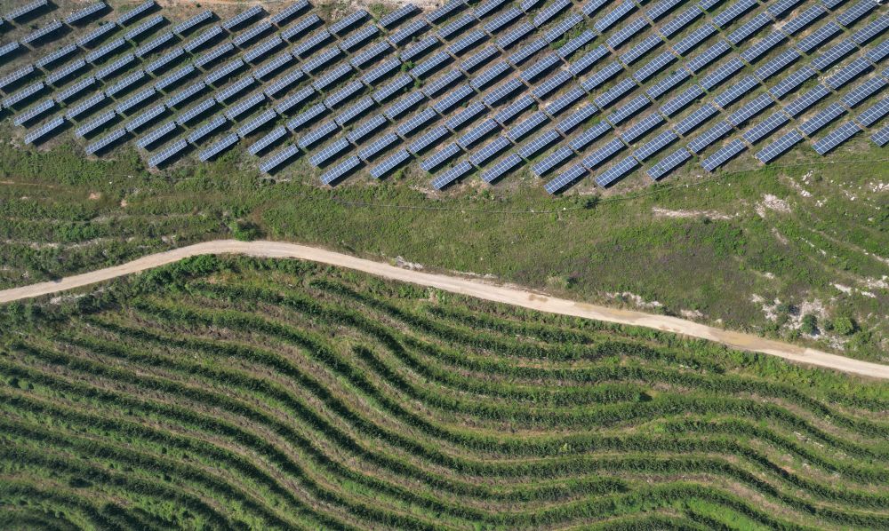 ↑这是河北省玉田县唐自头镇一处经荒山开发而建的果园和光伏发电场(9月15日摄,无人机照片)。 新华社记者 牟宇 摄