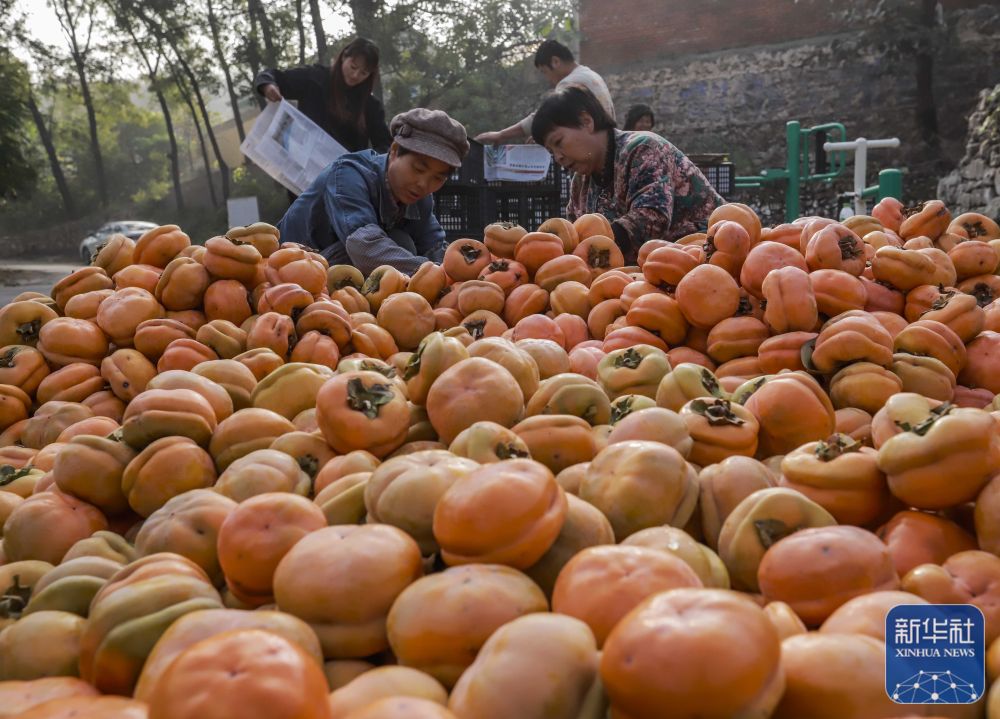 10月29日,农民在遵化市一家水果专业合作社场院分拣收购的柿子,准备装箱外运。新华社发(李磊 摄)