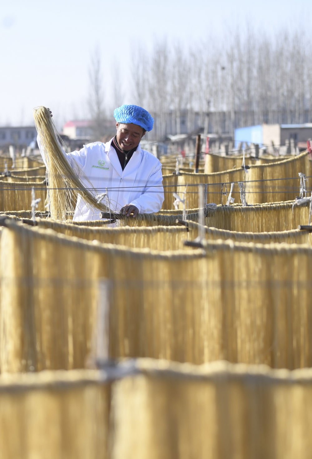 初冬时节,气温骤降,正是传统手工粉条加工的好时节。在河北省迁安市,农民们忙着加工晾晒粉条供应市场。近年来,迁安市着力构建“一村一品”产业发展格局,鼓励有条件的村庄和农户利用冬闲时节从事粉条加工产业,不断开拓省内外市场,有效拓宽群众增收途径。