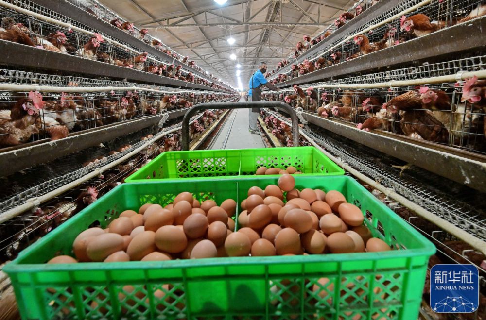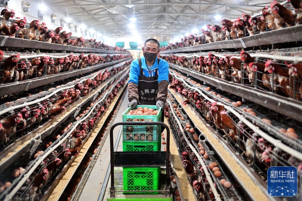 ↑12月16日,河北省滦州市滦城街道办事处后明碑村一家蛋鸡养殖合作社的社员在鸡舍内捡拾鸡蛋。