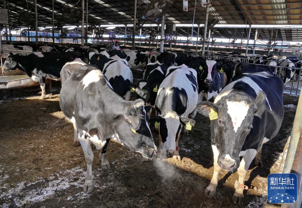 ↑12月16日,河北省滦州市滦城街道办事处范庄村一家奶牛养殖合作社的社员在给奶牛投喂饲草。